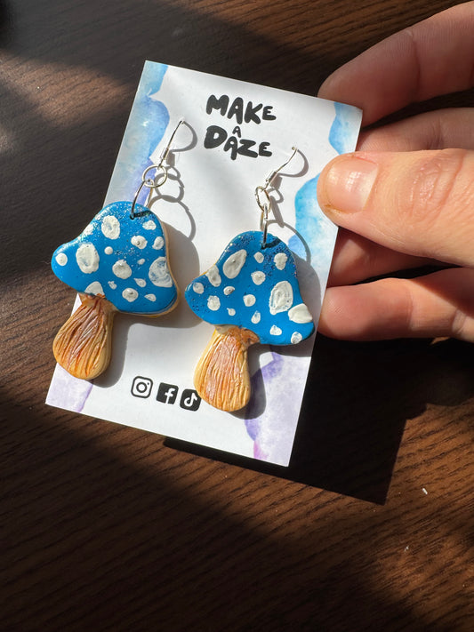 Blue Toadstool Hand Painted Sparkle Mushroom Earrings