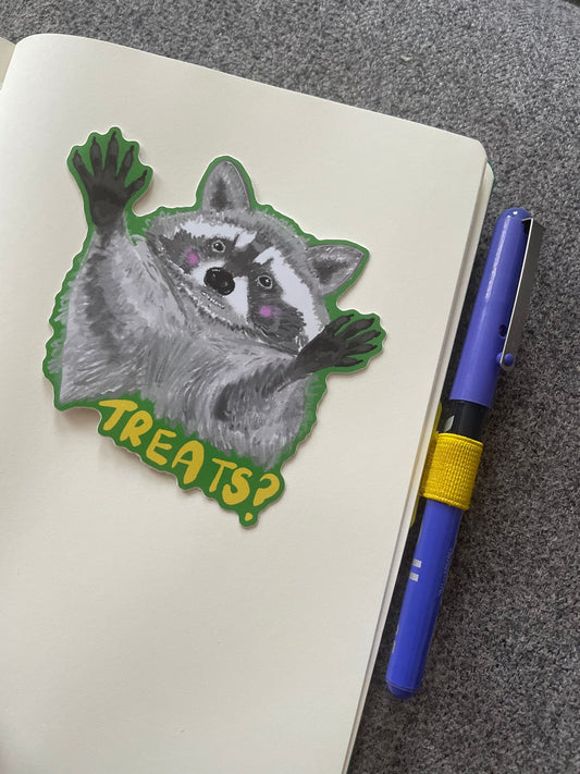 Racoon “Treats?” Vinyl Sticker, Trash Panda Art