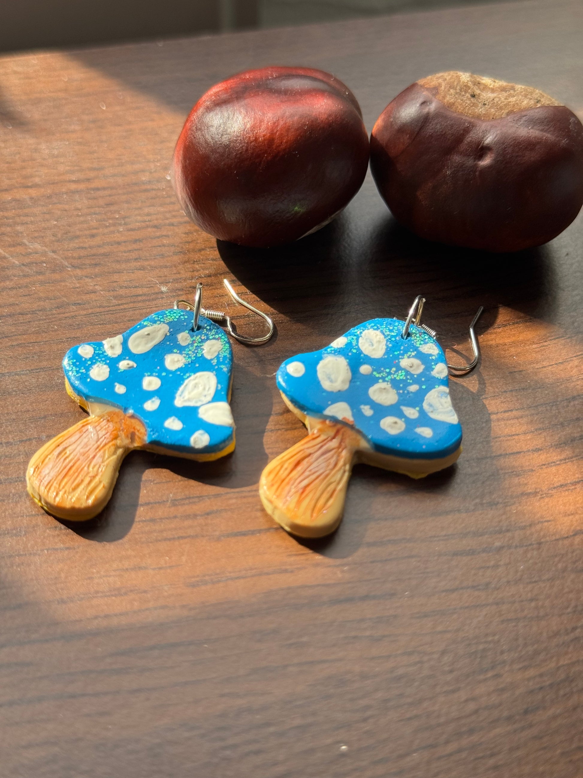 Blue Toadstool Hand Painted Sparkle Mushroom Earrings