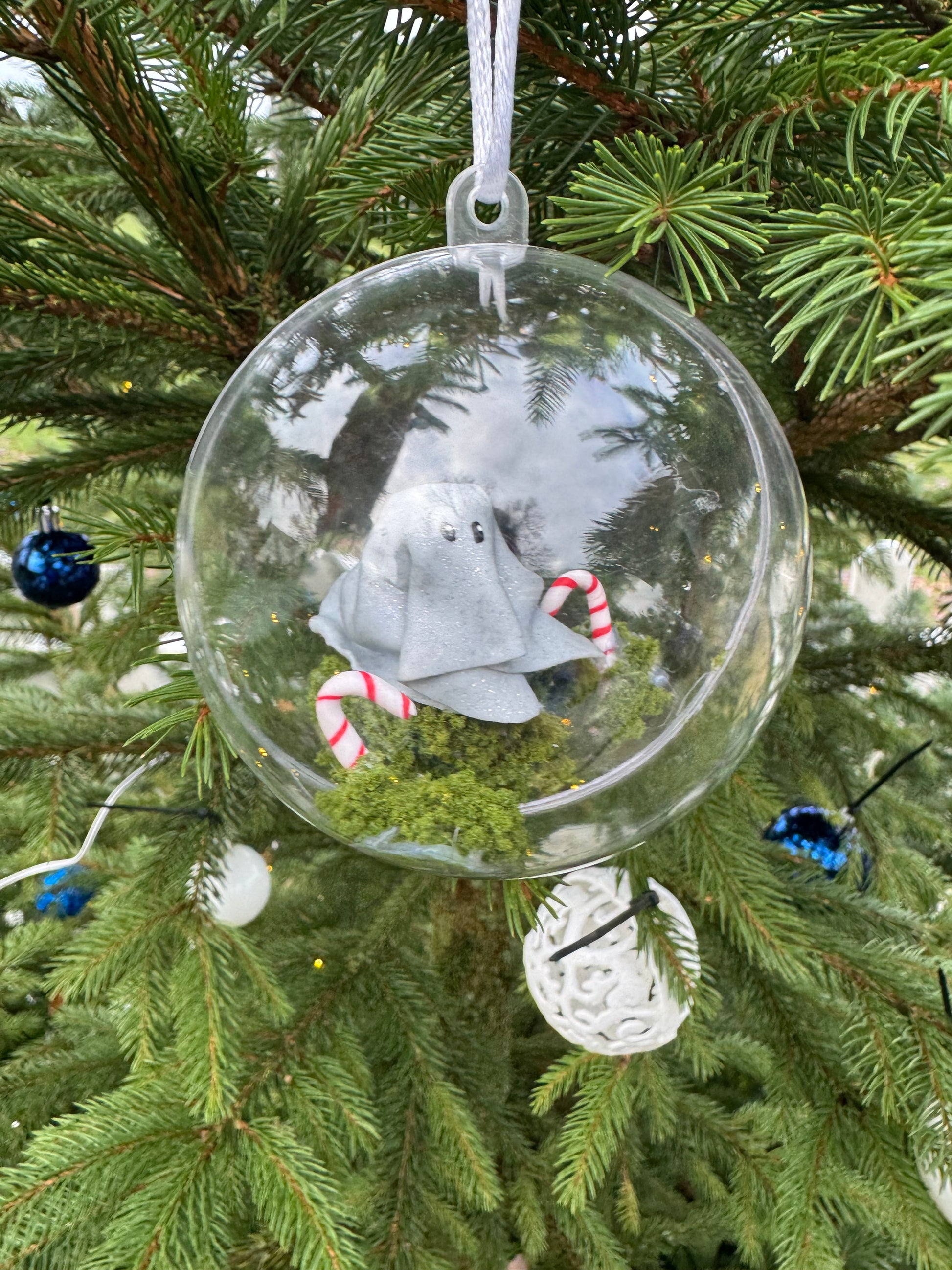 A little folklore festive scene handmade in a large plastic bauble. A wee festive christmas spirit in a forest scene that would fit perfectly on any tree.