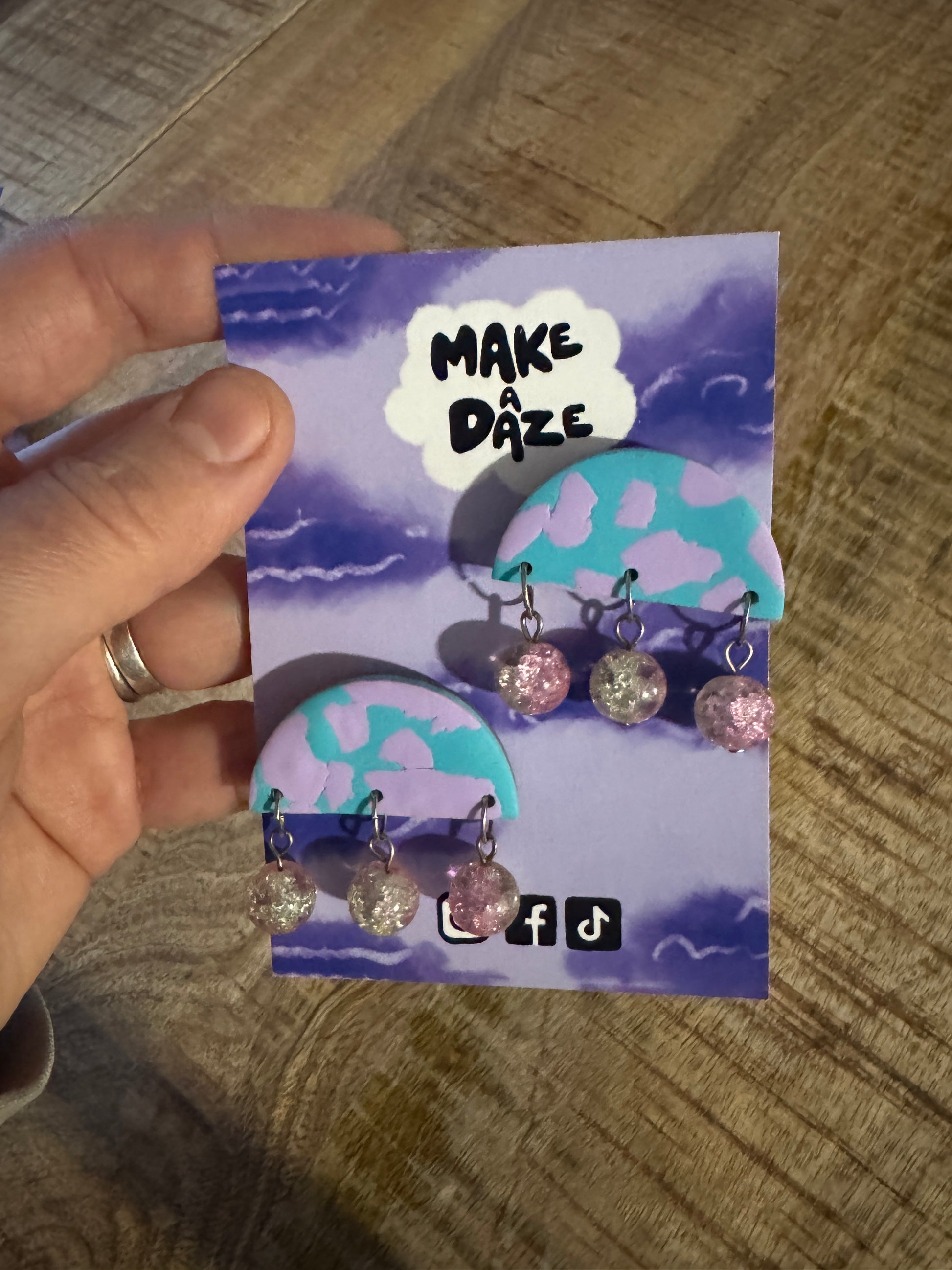 Abstract Blue and lilac/pink print Stud Statement Half Circle-shaped Studs with hanging beads attached. The beads are a pink and clear tone with a “cracked” effect to create an illusion of texture within the bead.