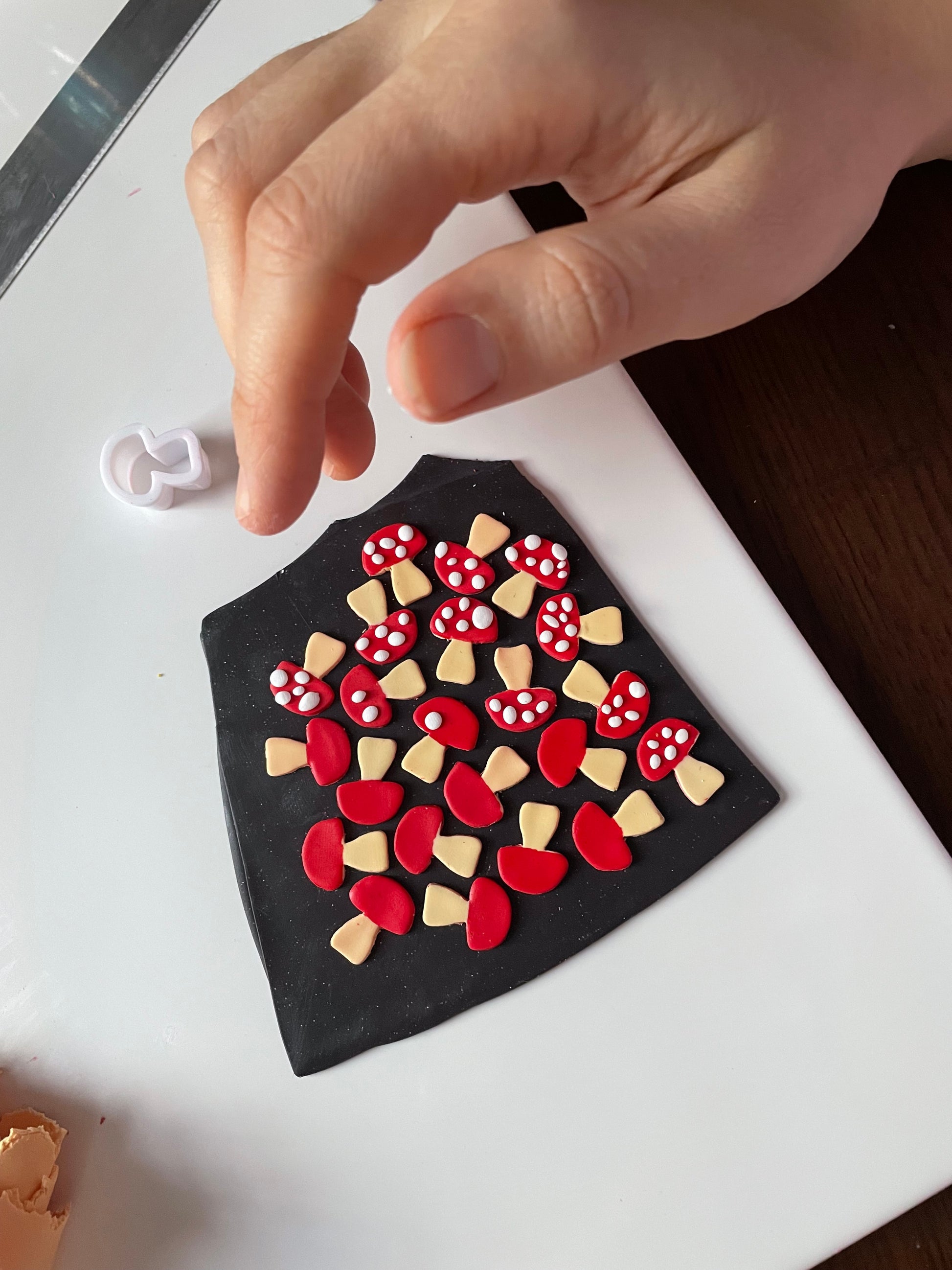 Sparkle glitter cutie Mushrooms design earrings. These earrings are handmade from polymer clay which is cut into individual pieces to make one-off pairs.