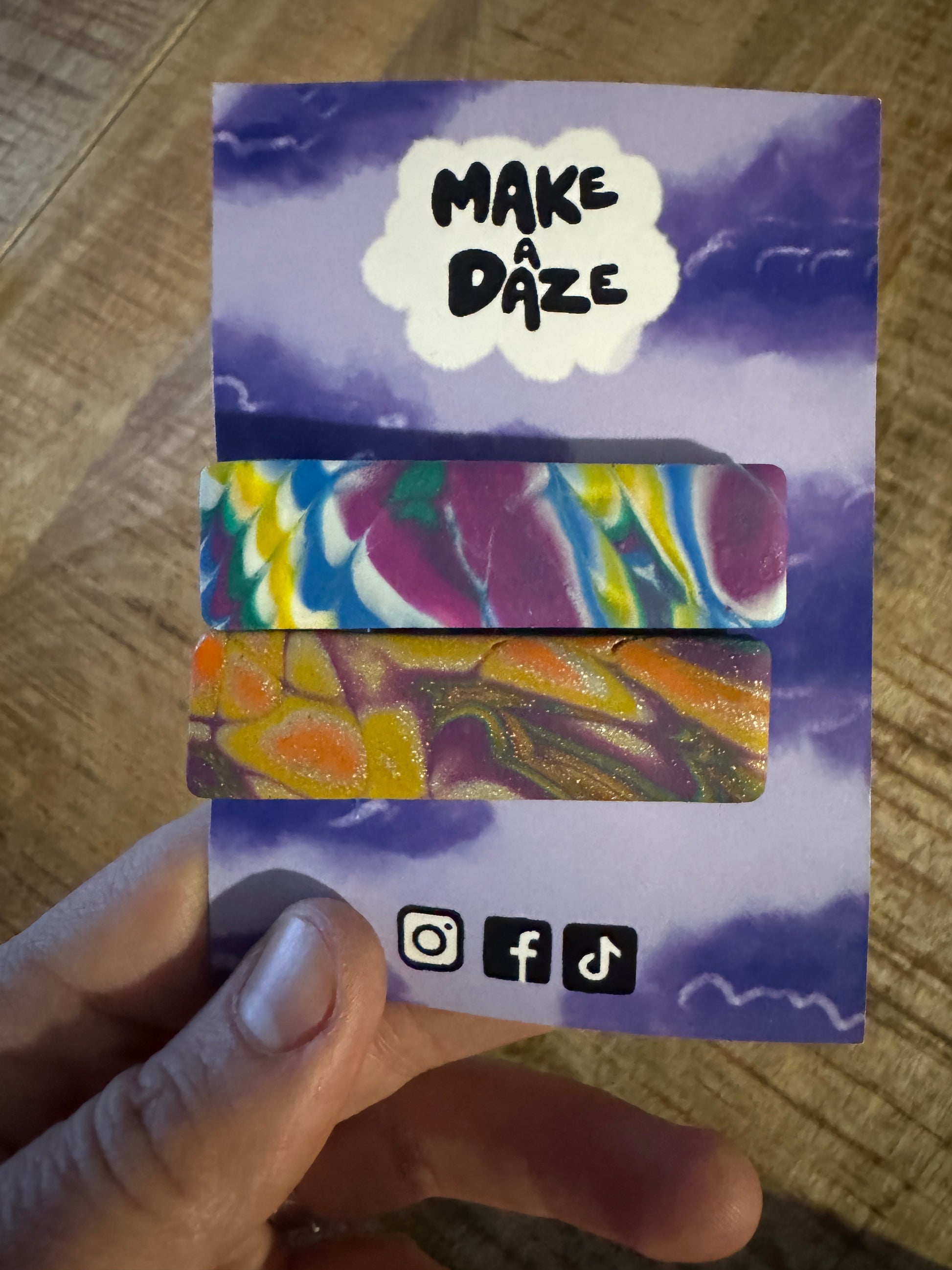 These hair clips are handmade from polymer clay which is cut into individual pieces to make one-off pairs. All designs aim to use up leftover clay from other pieces - aiming to reduce waste, reuse and recycle normally wasted clay.