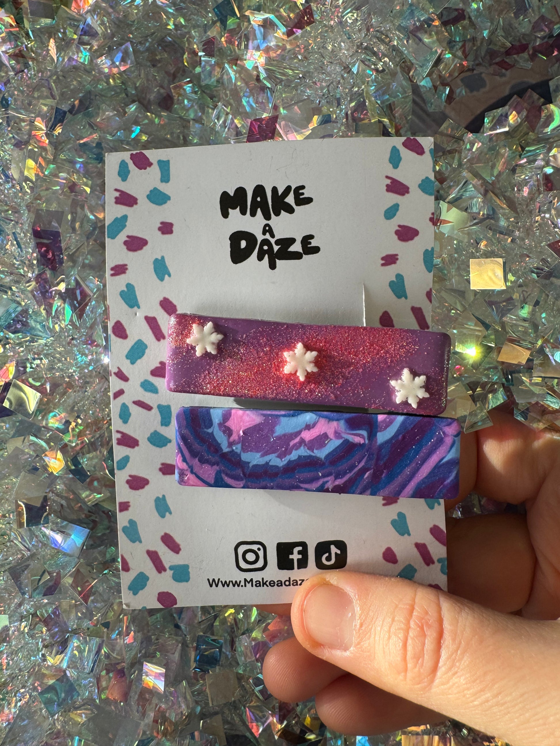 These hair clips are handmade from polymer clay which is cut into individual pieces to make one-off pairs. All designs aim to use up leftover clay from other pieces - aiming to reduce waste, reuse and recycle normally wasted clay.